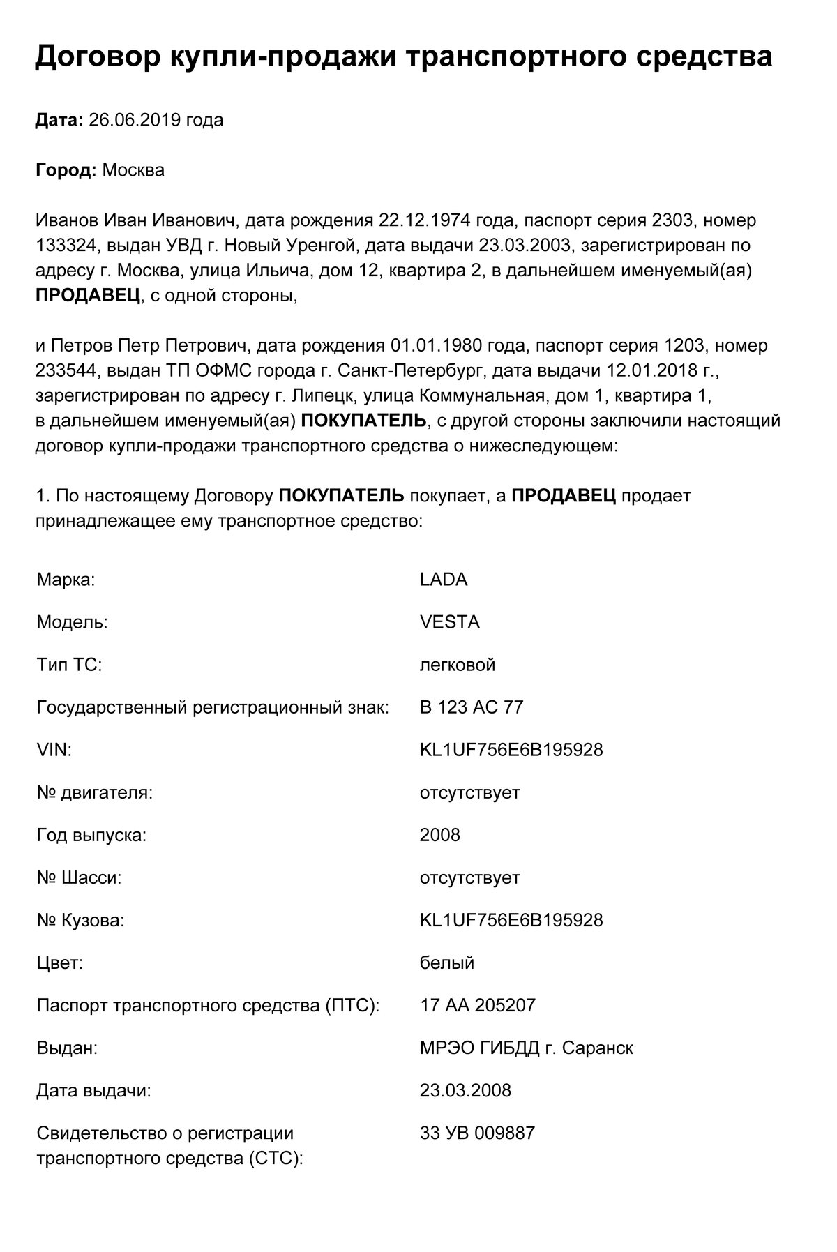 Примеры заполненных бланков мы привели ниже и еще сделали пустые шаблоны договоров купли-продажи автомобиля: