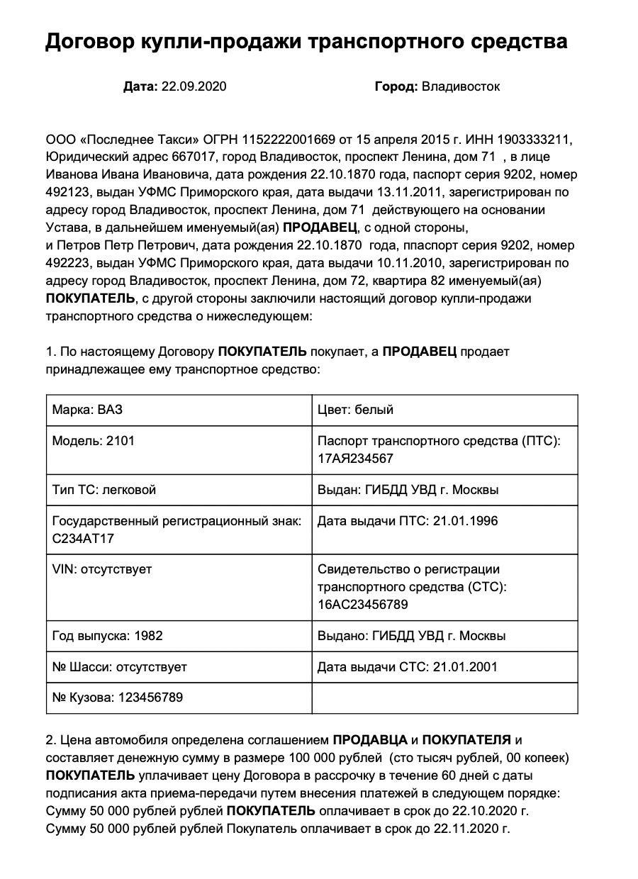 Покупка автомобиля в рассрочку. В этом случае в договоре купли-продажи указывают, что стоимость транспортного средства выплачена не полностью, и прописывают порядок выплат, сроки погашения и размер ежемесячного платежа.
